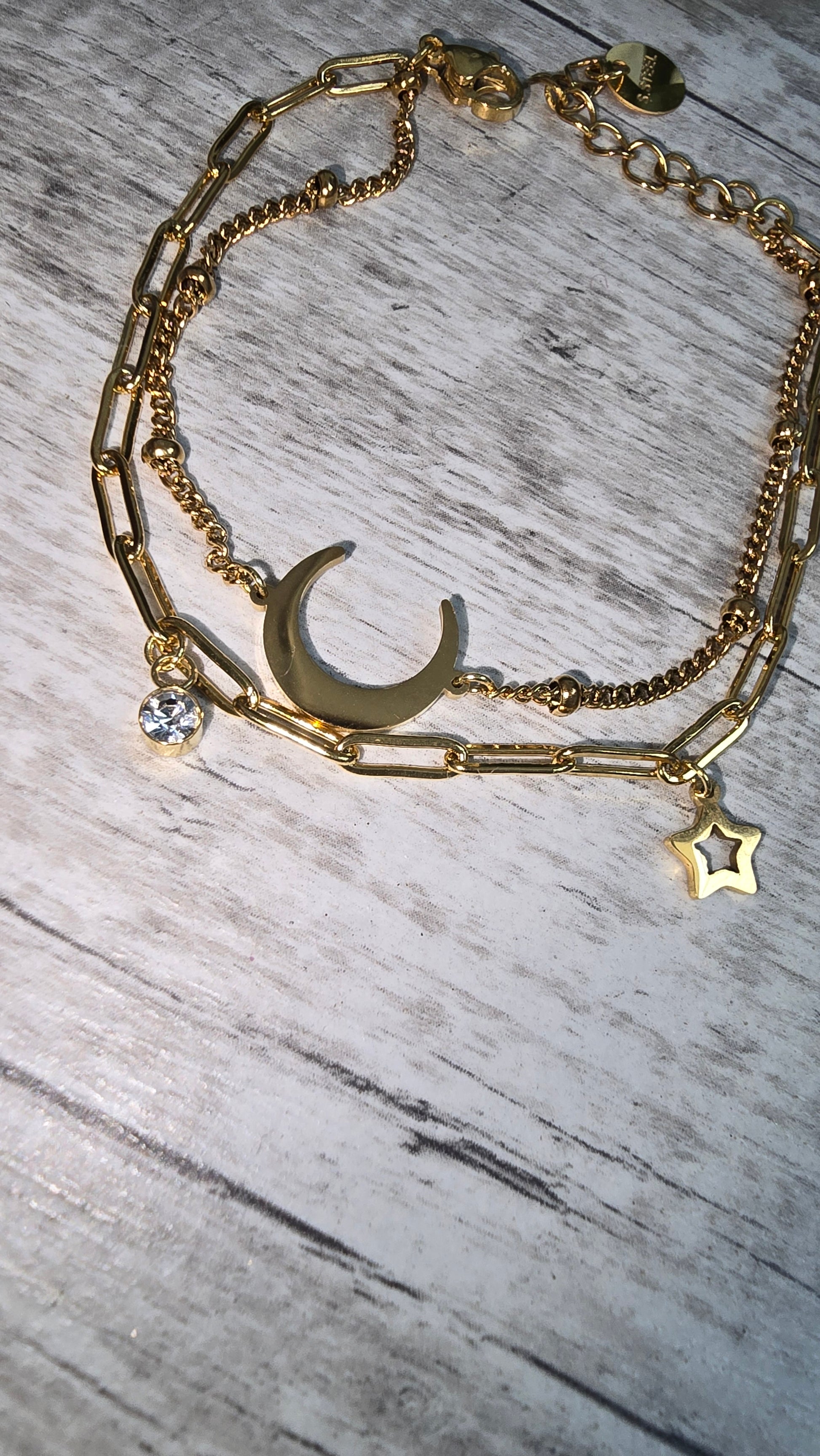 - Bracelet acier double rang pendentifs lune, étoile, strass